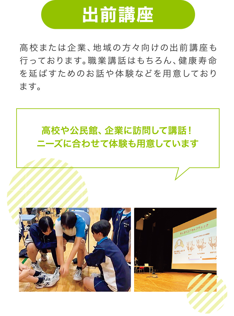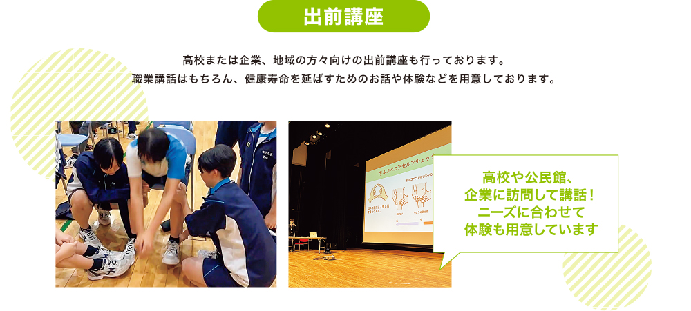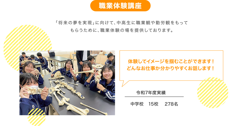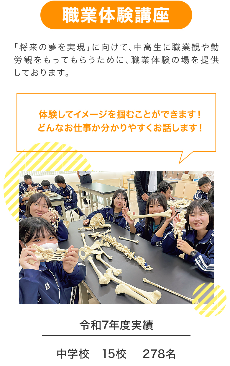 「小学生・中学生・高校生・地域各種団体」向けに職業体験・出前講座を行っております。
